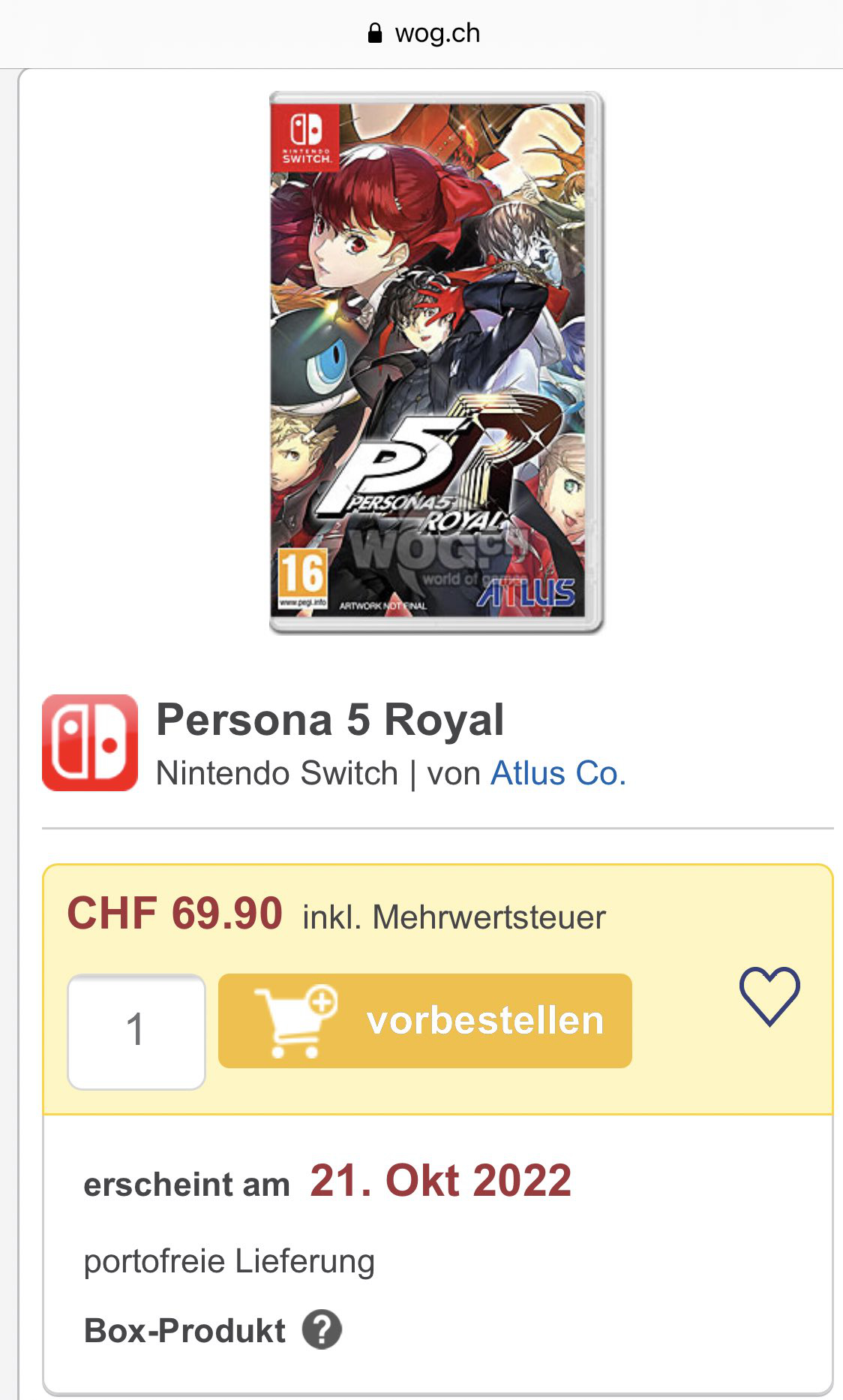 As discovered by Twitter user ‘CrocOclock’, the Swiss website WOG (World of Games) posted a listing on their website for a Switch version of Persona 5 Royal. Set for the same date as the Xbox and PC release (21st October 2022), the listing includes an image of the game’s box art and Switch case – adding credence to its legitimacy.