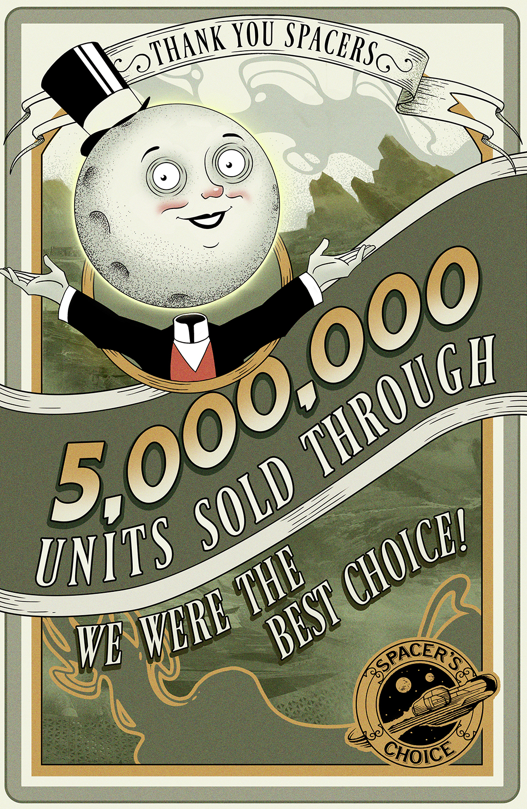“The Board is excited to announce we have employed 5 Million spacers in the Halcyon Colony! We've sent you a mock apple and Spectrum Vodka to celebrate this achievement and our 4th anniversary! Do not fret; we've covered the cost of this celebration gift with your paycheck.”