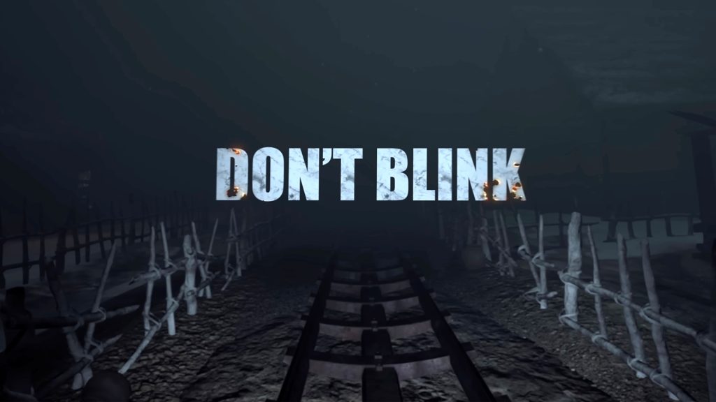 “A door painted with the instruction ‘don’t blink’ opens up into a room of blood-smeared mannequins in harlequin masks, their bodies twisted into unnatural poses. Eventually we can’t help it any more, and let our eyelids flutter closed. When they open again, the mannequins have been rearranged – or have rearranged themselves. Another blink, and it happens again, except that one of them has now come to life. As we repeat this process, we learn to use our eyes tactically, only blinking once our guns are readied.”