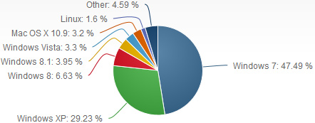 NetApplications, a leading provider of Web analytics tools, found that Windows 8 and Windows 8.1 operating systems were installed on 10.58 per cent PCs used for Internet surfing in January. Shares of Windows 7 and Windows XP were 47.49 per cent and 29.23 per cent, respectively. NetApplications’ data is based on analysis of 160 million visits to certain web-sites.