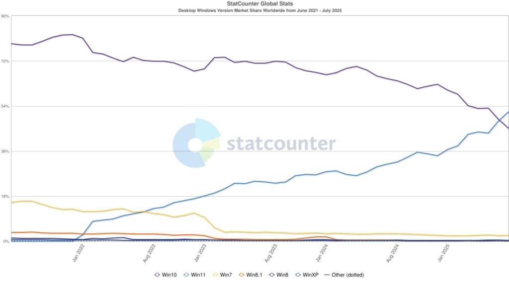 This marks a significant turning point for Microsoft, which has observed a relatively gradual adoption rate for Windows 11 over the past few years. However, as of July 2025, data from StatCounter (via PCGamer) indicates that Windows 11 now accounts for over 50% of all Windows PCs, finally surpassing Windows 10's market share (by about 6%).