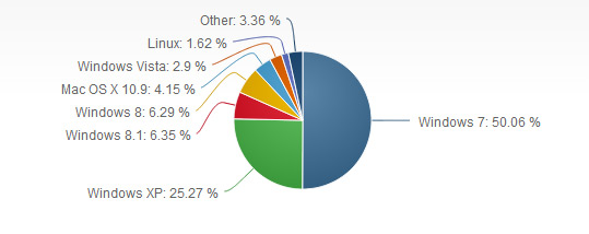 In first place of course is Windows 7 still, with over 50 per cent of all systems now using the five year old software. In second place though, is Windows XP, arguably Microsoft's most successful operating system ever released, with 25.27 per cent. In third is the aforementioned Windows 8.1, with 6.35 per cent and following along just behind it is Windows 8, with 6.29 per cent.