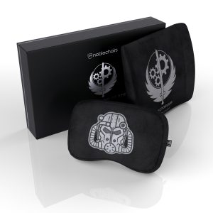 Joining the chair itself are three sets of Fallout memory foam pillows, each with a different style. One is Nuka-Cola Quantum-themed, another carries the Fallout 25th Anniversary logo and the final pillow set carries the Brotherhood of Steel emblem.