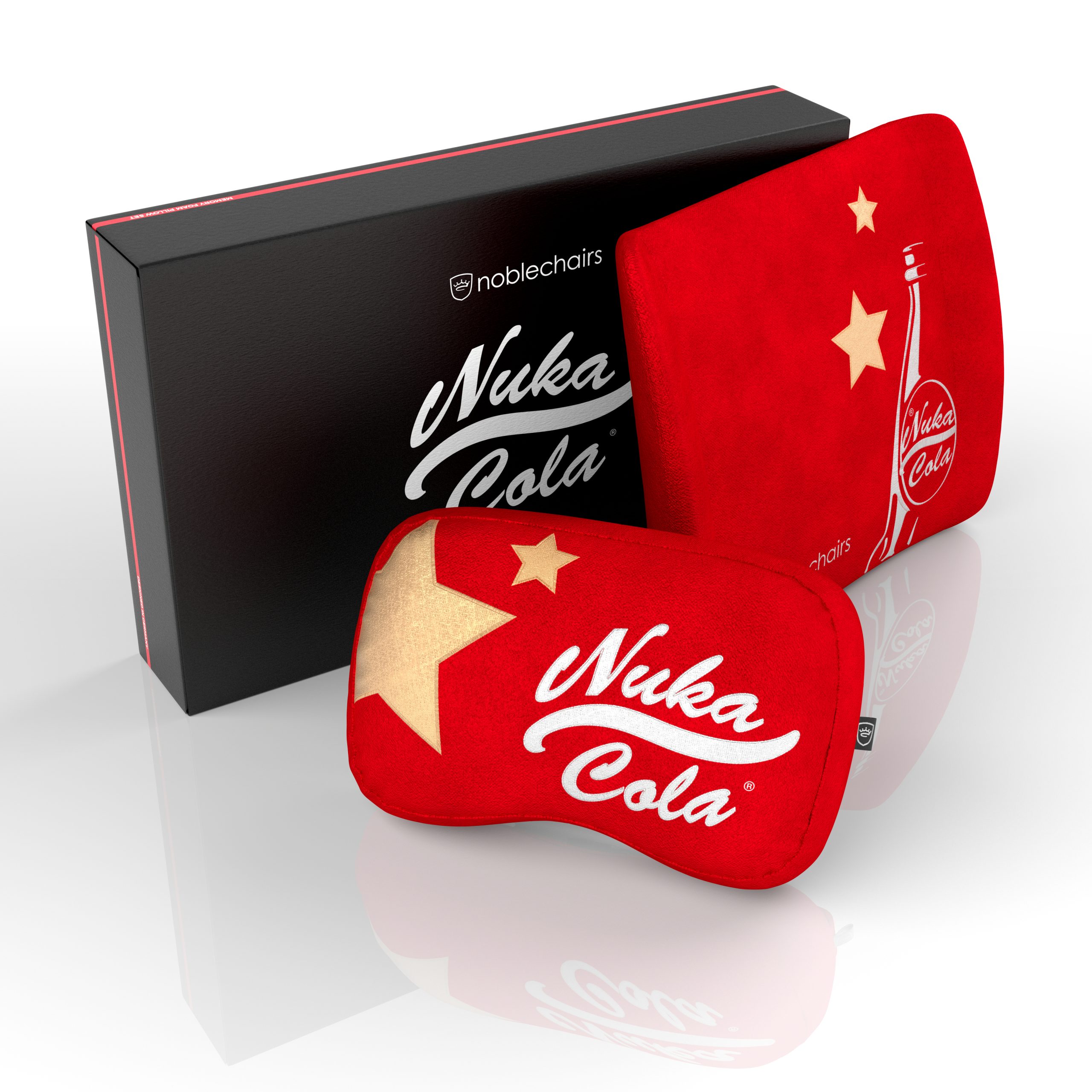 With 4D armrests, a rocking mechanism, adjustable height and recline features as well as breathable cold foam upholstery and PU leather, the noblechairs Nuka-Cola Edition is ergonomically comfortable. Aside from the chair itself, noblechairs is also releasing a Nuka-Cola themed memory foam pillow set.