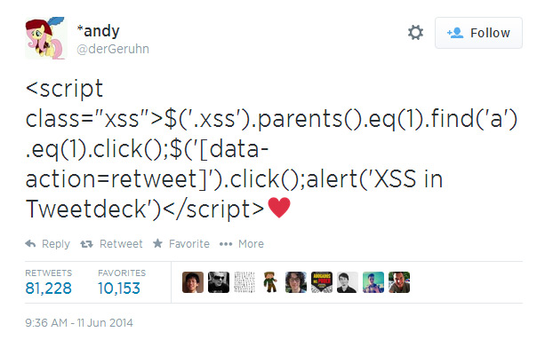 Before it could be shored up however, others discovered it, leading one user to tweet out a script which automatically retweeted it through your account if viewed through TweetDeck.