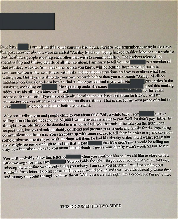 Worse yet, these are follow up letters. The person behind these was also behind original letters sent to the husbands making similar demands. Now seemingly they've upped the ante by contacting spouses directly, thereby enhancing the embarrassment and/or anger of the situation.