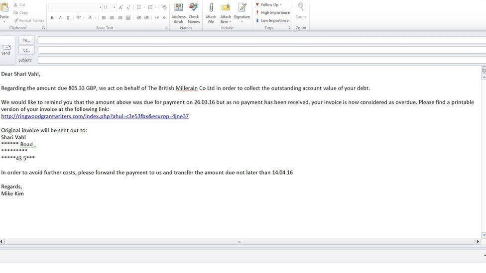 While some no doubt clicked the link, potentially infecting themselves with malware in the process, others rang through to the respective companies, often concerned or angry that they were being accused of being in arrears. Of course those companies had little idea what they were talking about, no doubt providing some measure of relief, but also confusion.