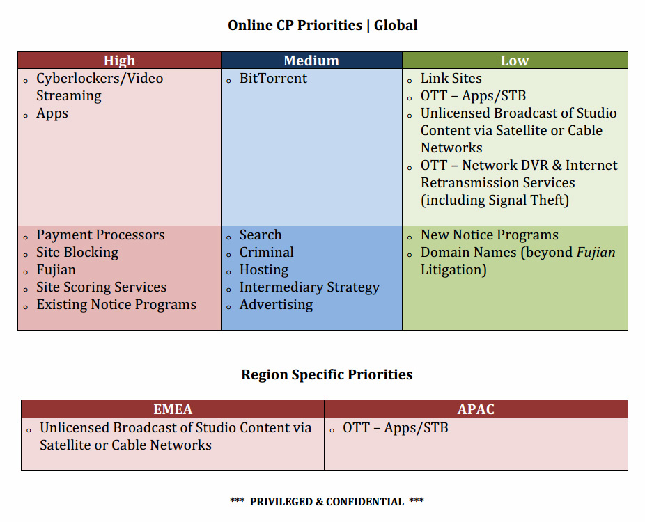 “…the attached represents priorities and activities presuming online CP is adequately resourced. Your teams understand that, depending upon how the budget process plays out, we may need to lower priorities and activities for many sources of piracy and/or antipiracy initiatives.”