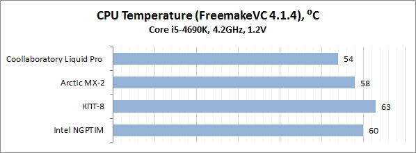 In a bid to test efficiency of the NGPTIM, Ilya Gavrichenkov, a renowned microprocessor expert, removed the lid and switched Intel’s NGPTIM with different thermal compounds. During the tests the base frequency of the Core i7-4690K processor was increased from 3.50GHz to 4.20GHz, the VCore was set at 1.2V and the TurboBoost 2.0 technology was disabled. The microprocessor was cooled-down by the Noctua NH-D15 cooler. The CPU temperatures were measured under two types of load: Extreme (created by AVX2-supporting LinX 0.6.5 stress test utility) and Typical (created by Freemake Video Converter 4.1.4 video transcoding software).