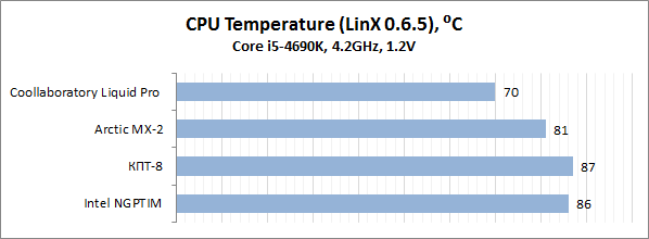 Usage of more efficient Coollaboratory Liquid Pro thermal paste allowed to overclock the Core i5-4690K processor to 4.60GHz with 1.46V voltage, which is 200MHz higher compared to a result with Intel’s new thermal interface.