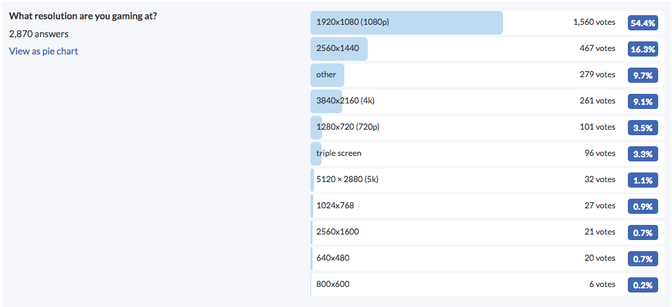Ultra HD gaming is certainly the future, but capable partnering hardware is still expensive and this is prohibitive for many people. However while only 0.82% of the user base who voted in the Steam Hardware Survey use a 3840×2160 (4k) panel (see above), in our poll we had 9.1% voting that they played games at 4k. These are likely gamers with at least one (or even two) Fury, GTX 1080, GTX 1080ti or Titan graphics card(s).