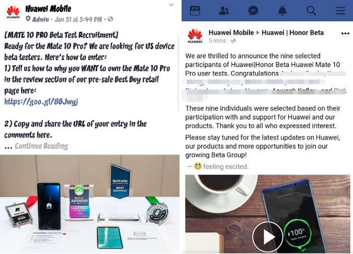 Reviews for the Huawei Mate 10 Pro began popping up on the Best Buy listing the day the company announced its Facebook competition. The promotion offered the chance for nine people to beta test the upcoming phone. To enter, people had to post reviews to the Best Buy listing weeks before the phone's release, with no actual hands-on testing or knowledge. Around 108 reviews were posted over the course of the competition, many of them containing five-star ratings.