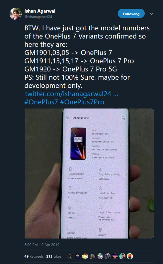 Agarwal’s input didn’t end there, as some digging revealed that there are potentially 3 separate models in the works, with a premium version housing 5G technology rounding off the range. This lines up with previous rumours that OnePlus is set to join the 5G coverage race as soon as possible, but the leaker seems uncertain given that there is no additional information.