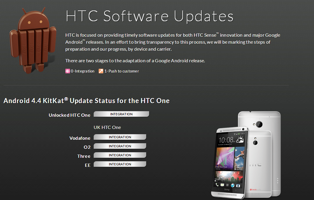 On the phone's official software upgrades page, the HTC One is shown as being in the integration stage of KitKat on all carriers as well as the unlocked device. This isn't the first time an Android update has had to be suspended, last year Samsung faced the same problem when rolling out Android 4.3, users were experiencing all sorts of problems including massive battery drain.