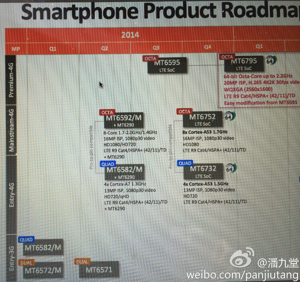 A Chinese blogger has published a new roadmap of MediaTek (which was republished by Chinese VR-Zone) that adds a premium system-on-chip for smartphones due in late-Q4 2014 or early Q1 2015 into the plan. The MediaTek MT6795 SoC is a 64-bit successor of the Cortex A17-based MT6595, which is available now. The MT6795 application processor is positioned higher than the eight-core MT6752 and will likely rival not only Qualcomm Snapdragon 610, but even the top-of-the-range Qualcomm Snapdragon 810.