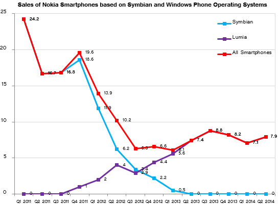 Sales of Lumia branded smartphones on the second quarter of calendar 2014 were up sequentially and year-over-year, but remained generally low. Despite of efforts by Nokia Corp. and Microsoft Corp., sales of Windows Phone-based Lumia handsets are below shipments of Nokia's Symbian-based smartphones several years ago.