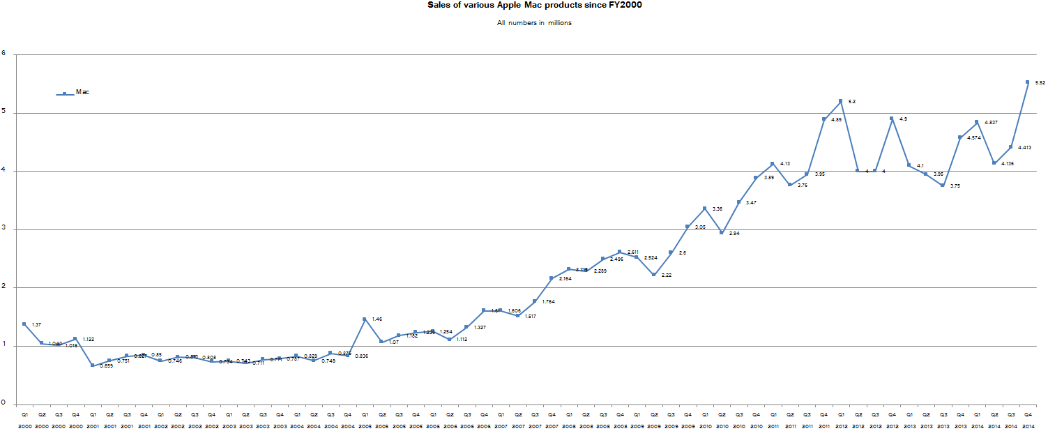 For the second time in the history of Apple, sales of Macs exceeded five million units per quarter and totaled 5.52 million units. It is especially remarkable that Apple has not released any all-new Macintosh computers during the quarter. Still, this year it made the entry-level MacBook Air, MacBook Pro (with retina screen) and iMac 21.5″ models more affordable, added muscle to its MacBook Pro and MacBook Air laptops and introduced its all-new Mac OS X “Yosemite” operating system.