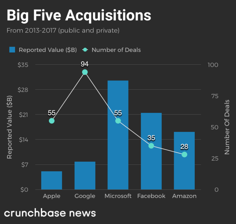 Despite the much lower value of spending, these 55 private company acquisitions go on to place Apple in joint-second place for buying startups, alongside Microsoft and only beaten by Google’s 94 deals since 2013. In fact, Amazon seems to have made the least acquisitions, with just 28 firms, followed by Facebook’s 35.