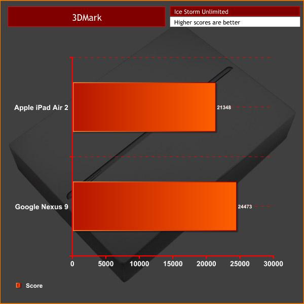 In 3DMark Ice Storm Unlimited, the iPad scored 21348. This is actually behind the 24473 of the Nexus 9 – but the Kepler GPU architecture clearly helps the Nexus here.