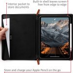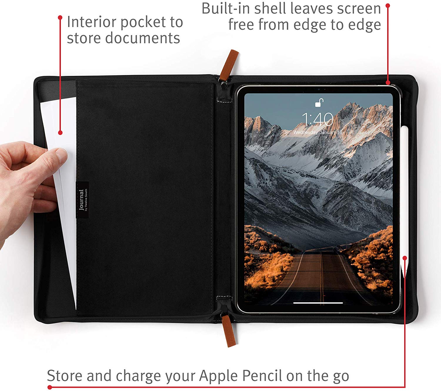 Journal cases for the iPad Pro also double up as a viewing stand for the device as well as being a typing and sketching wedge. The integrated kick stand holds the iPad at a comfortable viewing angle for various applications or illustrating with the Apple Pencil. An internal pocket offers a convenient place to store documents or a slim compact keyboard and there is also space to charge the Apple Pencil beside the iPad magnetic charger. Thanks to a snap-in-shell, the iPad Pro is held securely in the case without compromising the edge-to-edge liquid retina display.