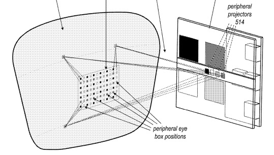 There would be a light engine and foveal projectors that beam through the holographic combiner, displaying images in the real world for the user to see. High resolution images would be displayed where a user’s eyes are primarily focused, while lower resolution images are displayed on the periphery, which is a performance saving technique often used in VR applications.
