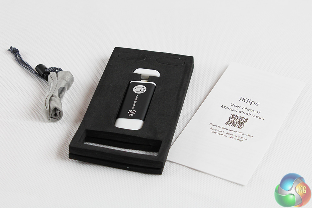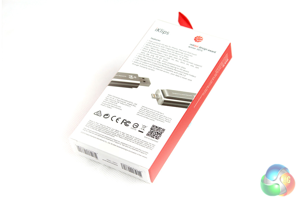 The Adam Elements iKlips is a straightforward USB stick, but the packaging at least is relatively creative. It comes in a bright red box listing many of the features offered by the hardware and software, such as backup, the dual-function USB/Lightning connectors and media playback.