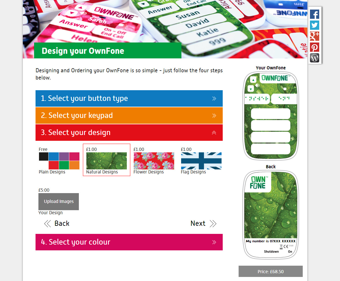 It's all very easily customisable through the OwnFone site, which lets you choose the model, the colour scheme, button type – and you can even upload your own images for the phone's cover.