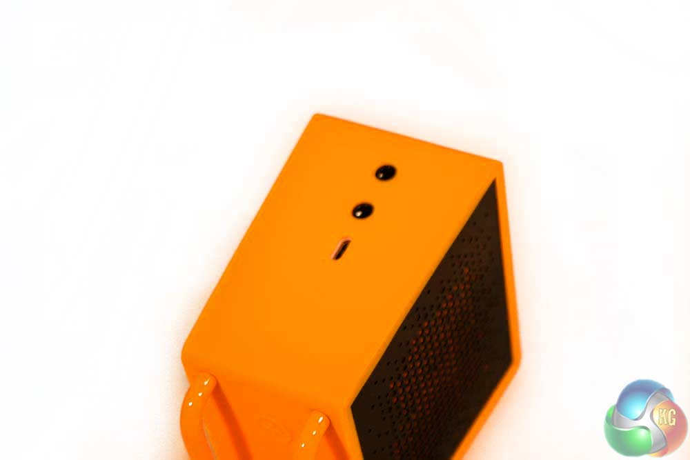 The actual speaker body itself is only the black central piece. The rest – all that orange – is actually a rubberised protetctive shell and in the case of the two metal protrusions on the top, further protection, a grab handle and something you can use to clip the speaker to a bag; or bandolier if you're feeling like a man about town.