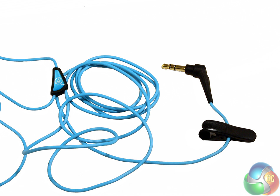 The cable for the Sonic Sport ATH-Sport1 is also quite eye catching, continuing the same bright, baby-blue throughout. It is reasonably long (1.2m) and has several little features along its length to avoid some of the annoyances of traditional headphone cables. There is the typical clip mechanism, that lets you pin the cable to your shirt or elsewhere to prevent it slipping, or pulling on the earphones. There is also a plastic divider to keep left and right earphone cables separate and another little one that lets you choose the length of each side's cable.