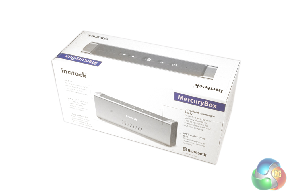 The packaging for the Mercury Box is quite basic, but functional. It is white with a large picture of the speaker itself, as well as its model number and package contents listed on the end. The rear breaks down some of its more attractive qualities – including waterproofing capabilities and auxiliary inputs.