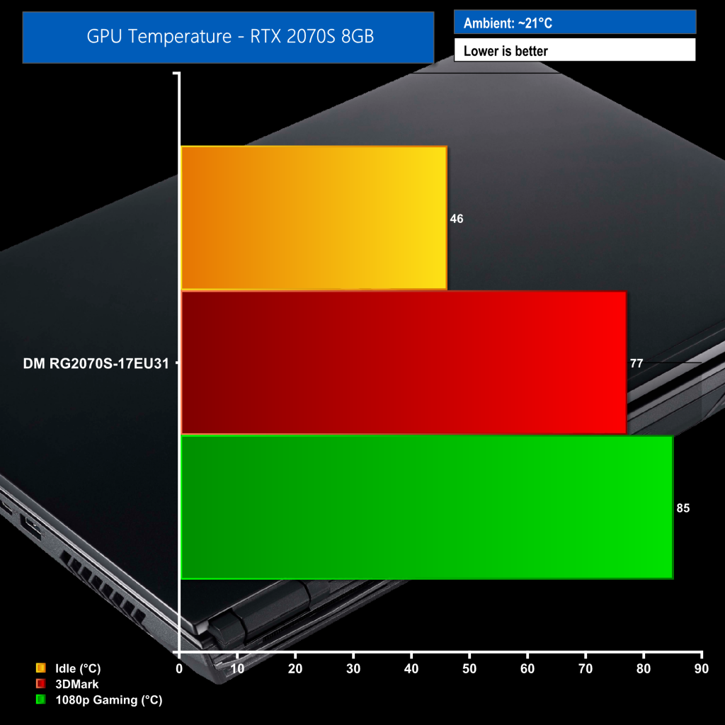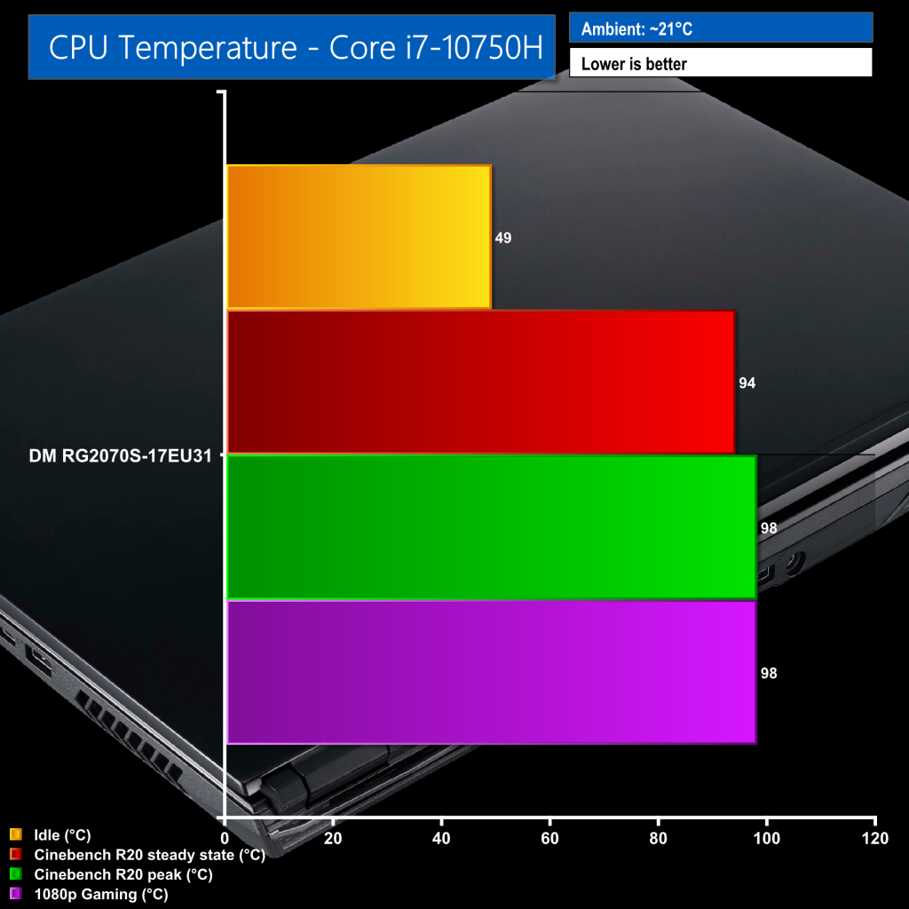 CPU temps were good when idle but under load it almost hit 100 degrees C, at 98, that’s pretty hot. Gaming laptops are known for their heat and the maximum operating temp for the i7 10750H is 105 degrees C so it shouldn’t be a big problem over time. The issue this kind of heat does create is degrading performance results.