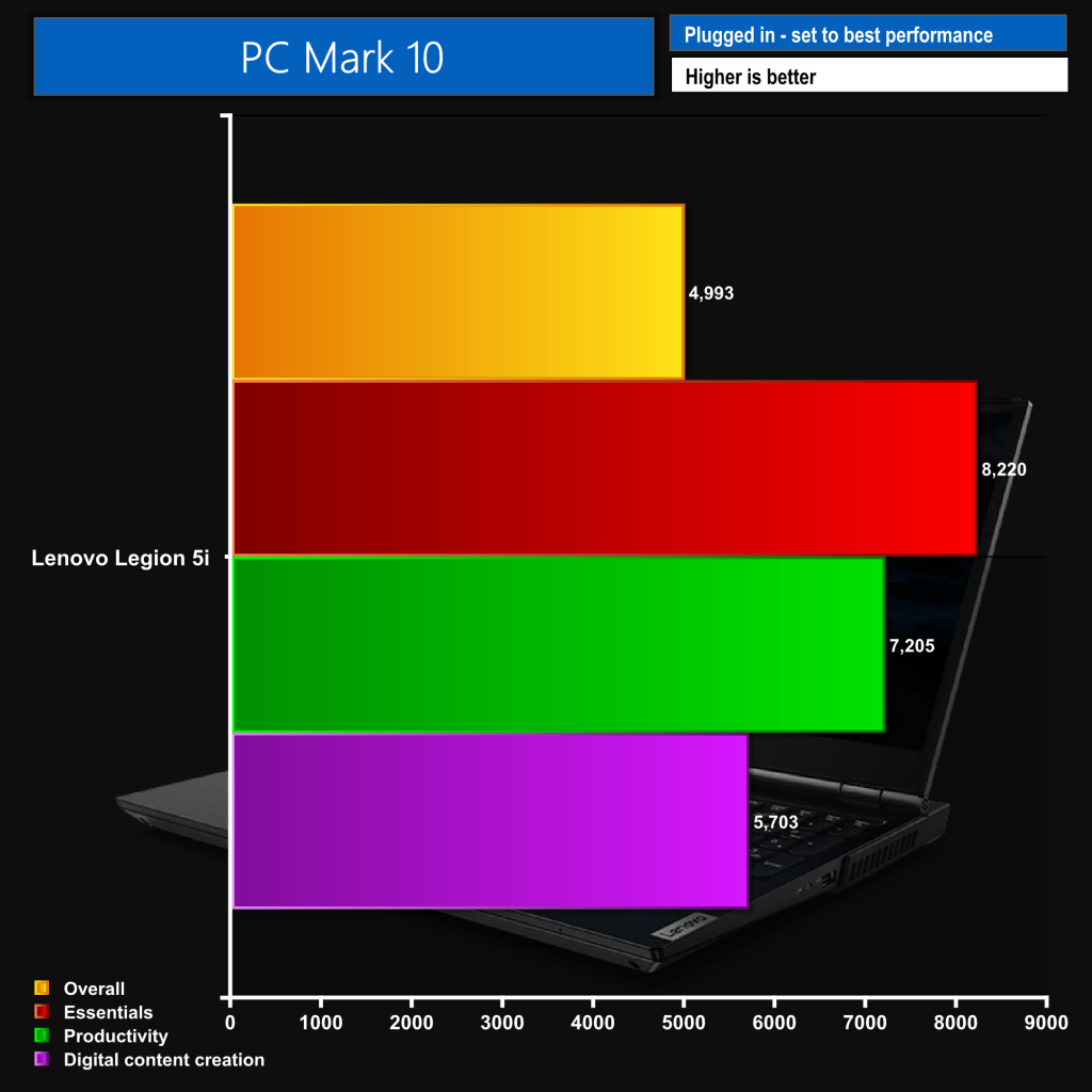 All tests were conducted whilst the laptop was plugged in, set to performance mode and put onto the 3rd mode when cycling through the profiles with Fn + Q shortcuts, for the best results we could achieve. We compared the Legion 5i to other laptops we have reviewed in the past, where possible.