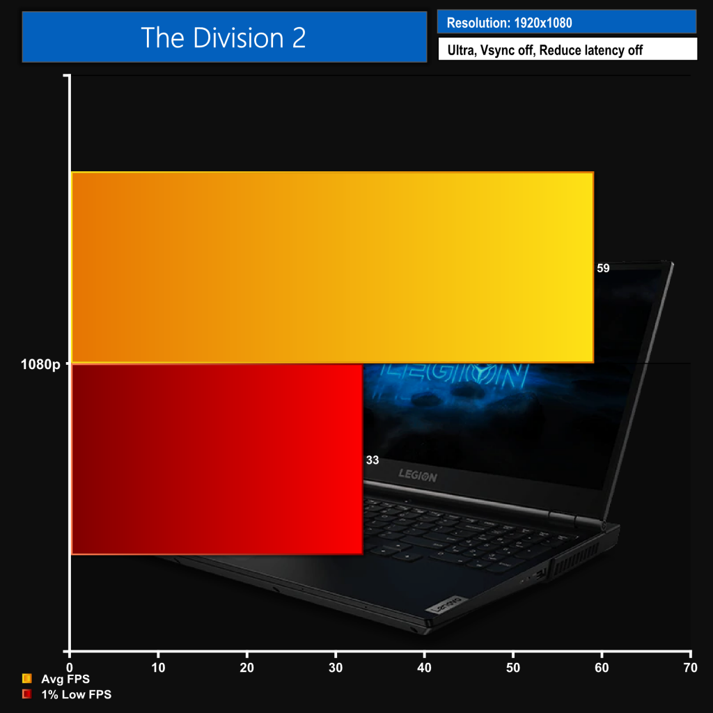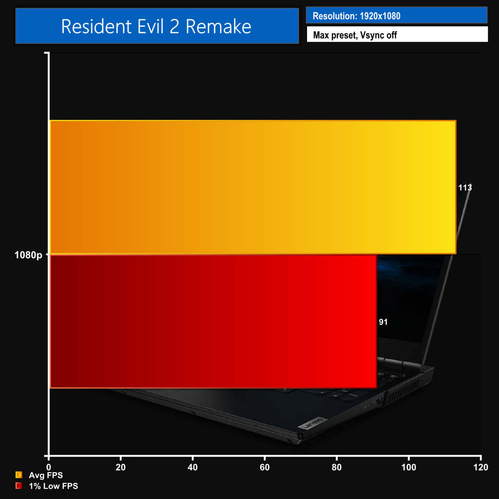 Starting with Doom Eternal our results show it’s far more than playable, this ran brilliantly and it looked great on the 144Hz IPS screen. The Division 2 and Shadow of the Tomb Raider saw a slight dive in performance, while Resident Evil 2 remake did very well. We expected these results as Division 2 and Tomb Raider are always a push at maximum settings. We still think these results are great, tweak some settings, maybe drop the shadows a little etc. and you’ll get better FPS but even at 60fps lowest these ran great.
