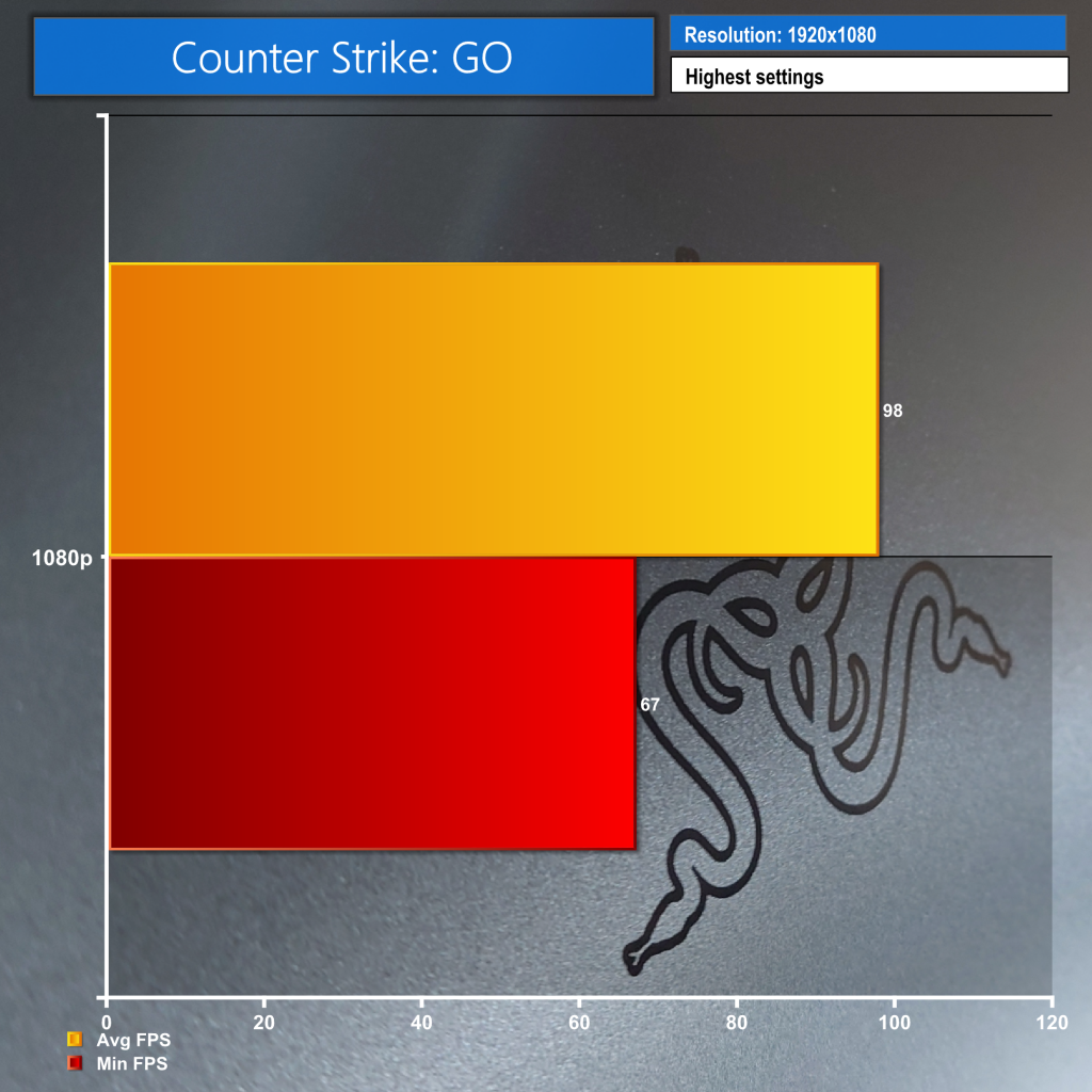 Next, we gave the opposite end a try, Counter Strike GO gave us minimum FPS of 67 and an average of 98 on the highest 1080p settings. Very playable and remember if you knocked a few settings down you could easily get over 100 FPS!