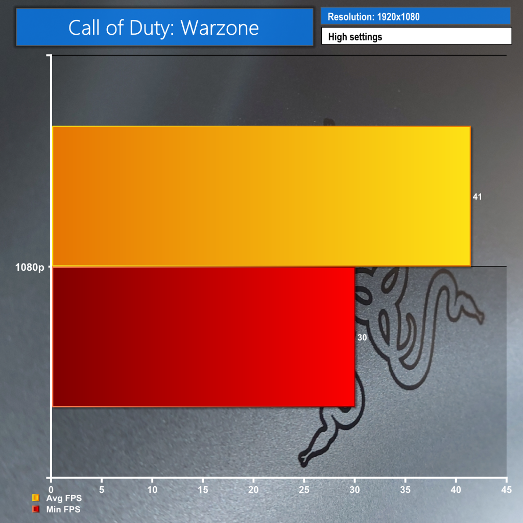 Finally, we tested everyone’s favourite, Call of Duty Warzone, again I pushed it up to high settings just to see and we got a min of 30 and average or 41. It’s fairly low but I’m seeing potential here! Drop a few settings and you could definitely get 60+ FPS here. Even at 41 I found it playable with only a few noticeable dips.