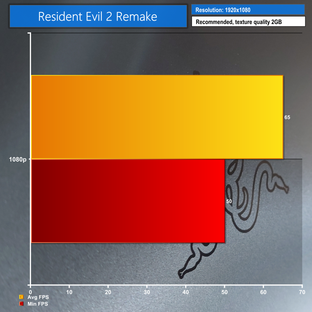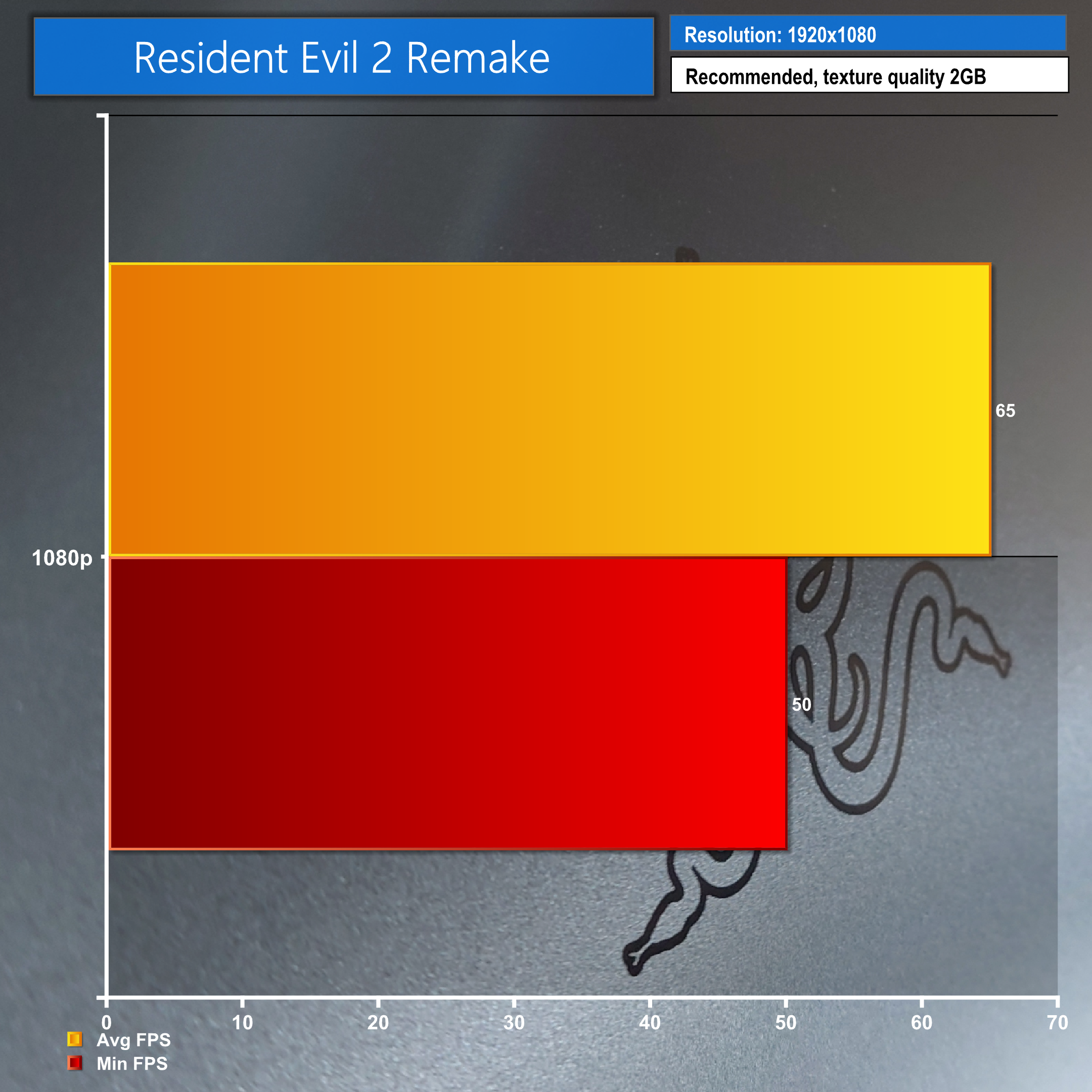 Resident Evil 2 remake on the recommended settings bumping texture quality up to 2GB gave us a minimum FPS of 50 and an average of 65, the game looked and played great and 65 FPS offered a smooth experience.