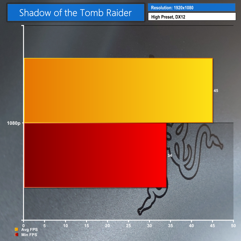 Let’s check out some gaming benchmarks! I tried to test various games, rather than targeting ones I knew would run great as I wanted to see if it was possible to play demanding games if you really wanted to. I ran Shadow of the Tomb Raider for that very reason, on a high preset at 1080p with DirectX 12 just to see if it could handle it, we got minimum FPS of 34 and an average of 45. I was generally impressed by this score, yes we have a 120Hz screen so you want that high FPS but if you spent some time making a custom graphics pre-set you could get the game running super smooth at a solid FPS, on a tiny, super portable ultrabook, that’s impressive.