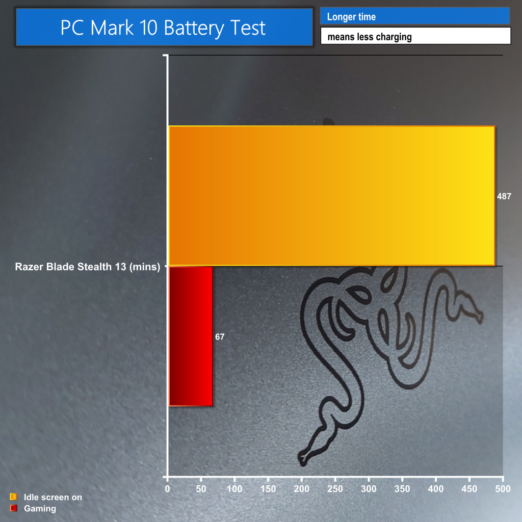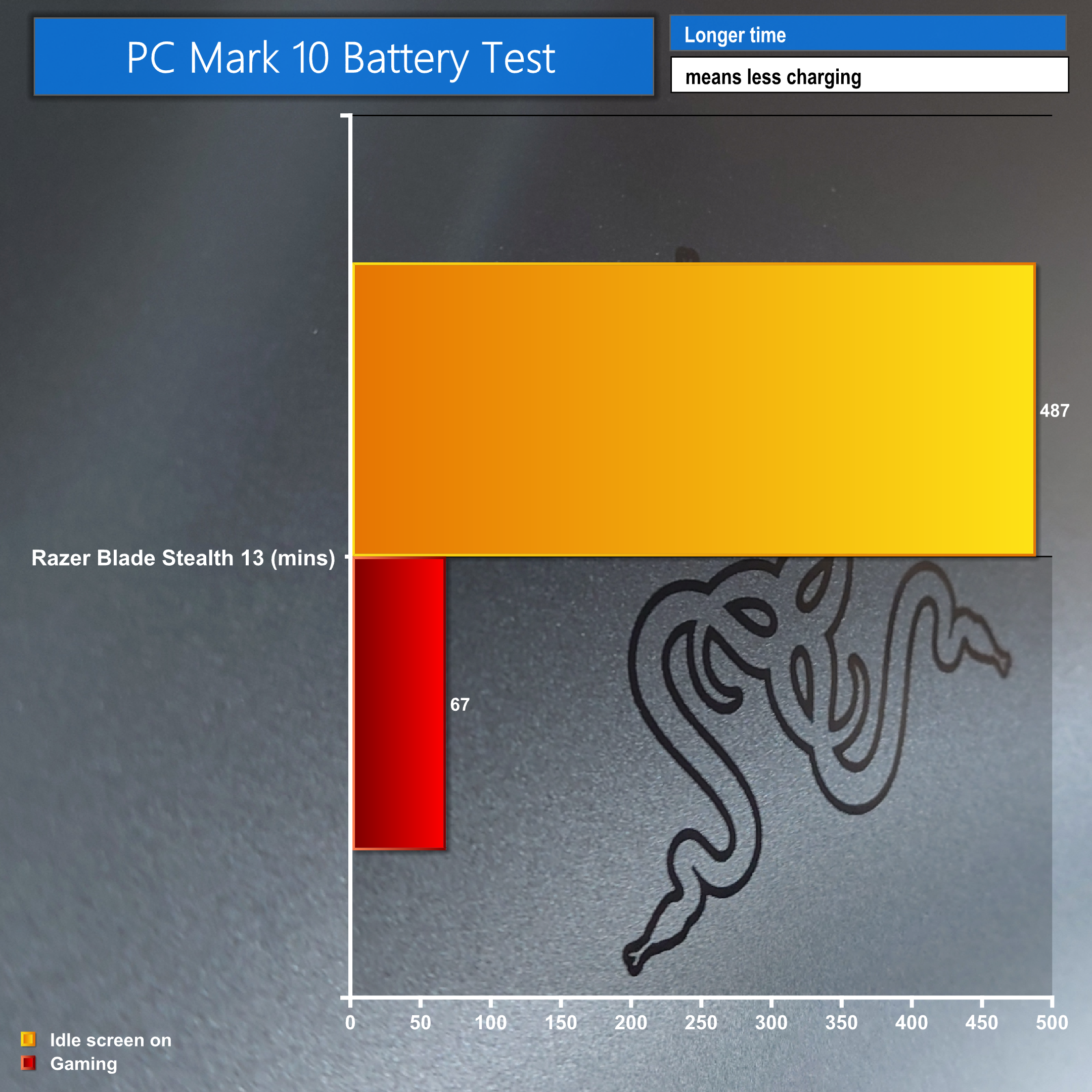 Our last, but not least, test was battery performance. We tested this with PCMark 10 Pro and saw a runtime of 67 minutes, so just over an hour of battery life under the gaming test. The idle test came in at 487 minutes, over 8 hours, but do keep in mind real world results will be better! Personally, while gaming intensively I saw around 90 minutes or more depending on the game.