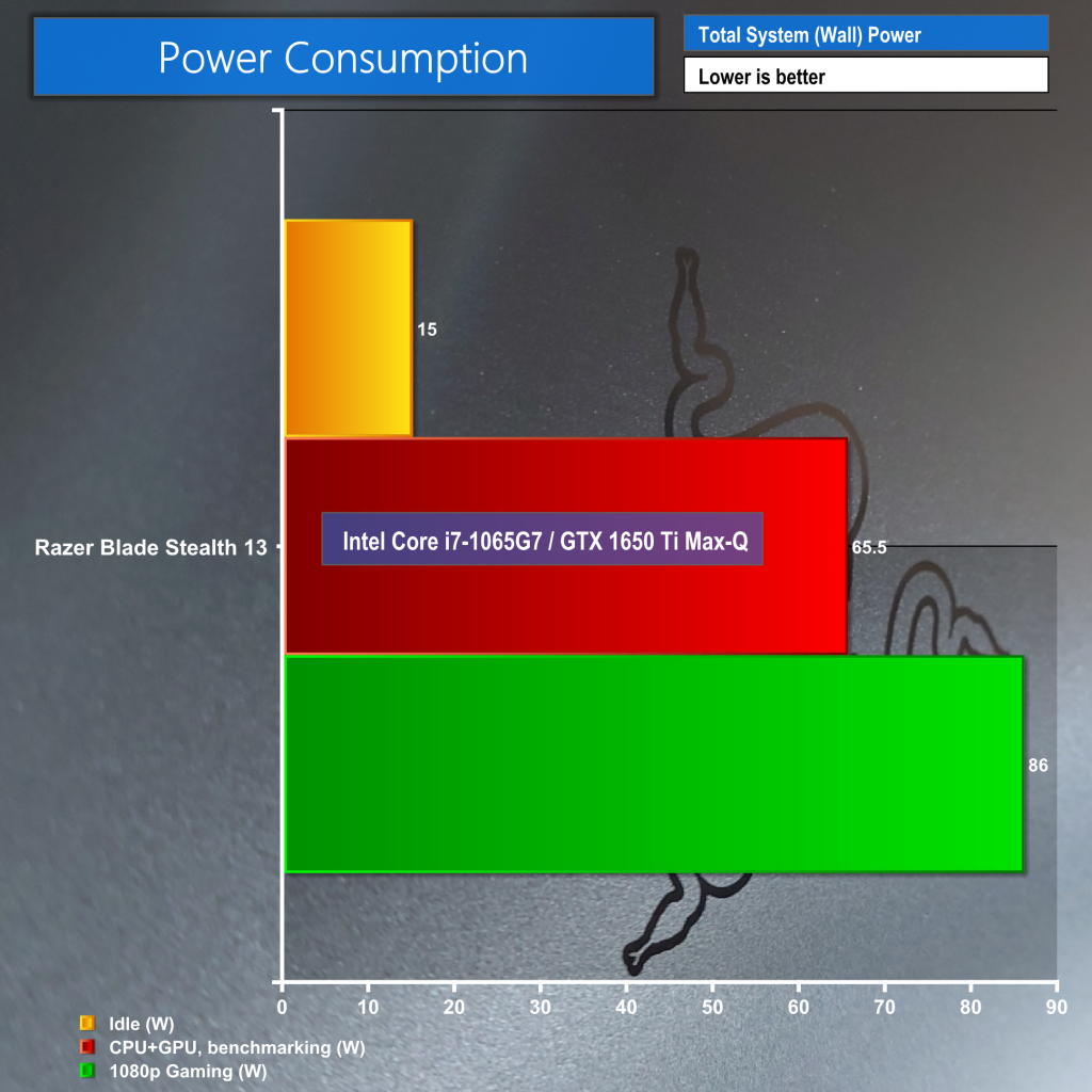 Power consumption when plugged in saw an idle draw of a mere 15 watts, whereas PCMark 10 benchmarks saw it soar up to 65.5w while gaming jumped even higher to 86w.