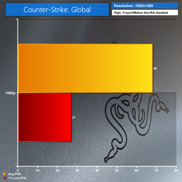 Counter Strike Global Offensive at 1080p, full screen, set to high with Vsync, motion blur and AA disabled gave us an average of just under 70fps and 1% lows of 27fps. Not ideal but just about playable if you really wanted to!