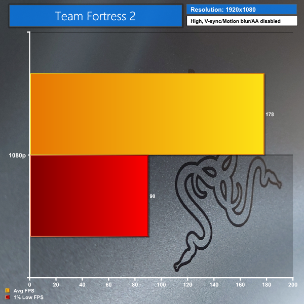 Finally, I tested Team Fortress 2, 1080p, full screen, set to high with Vsync, motion blur and AA disabled and we got much better results here, with just under 180fps average and 90fps for the 1% lows. Honestly his was really fun to play especially with the bright and vivid screen on the Book 13! It’s not a gaming laptop at all but if you’re in a pinch, some easy to run esports titles should play fine.