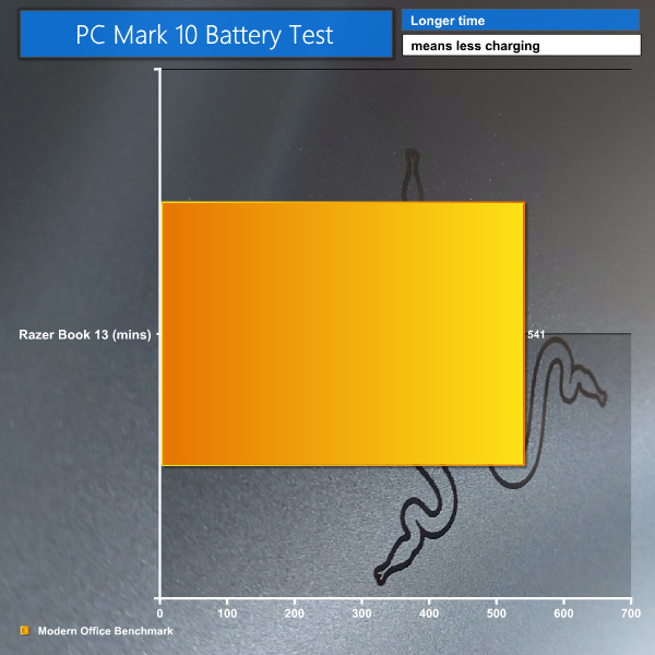 Lastly, PCMark 10’s battery benchmark Modern Office saw a total charge last 541mins or 9 hours and 1 minute, that’s pretty good and in actual use you can expect to get more than this so I think Razer’s claim of 14 hours battery is pretty accurate, but of course it depends on how you’re using it.