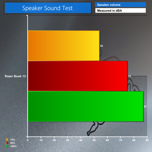 The audio is clean without any chassis rattle at all, yes, it’s very low on the bass side but that’s to be expected on an Ultrabook, it’s quite trebly with lots of high end but overall, I’m quite impressed with the audio. I expected it to be almost unusable but at around 50% it’s not only loud enough but brings those highs down just a tad. Going from 50% to 100% volume, there’s only an increase of 10dBa whereas going from 10% to 50% there’s a difference of 20dBa. I’d say it performs best at around 75% volume.