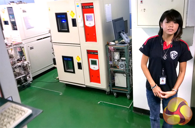 At MSI HQ, our young lady guide wasn't sure how close our lens could get to the thermal testing equipment, so we leaned in and asked her to keep a look out. You can get an idea of the ovens-n-fridges room from this shot. Products are constantly tested – even after sale (returned product gets tested the most) – to see what the engineering teams can learn and improve upon for the next spin.