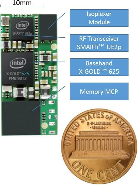 Intel’s XMM 6255 measures at just about 300 square millimeters, which makes it the world’s smallest standalone 3G modem. The XMM 6255 features the Smarti UE2p transceiver, which is based on the new Intel Power Transceiver technology, which combines transmit and receive functionality with a fully integrated power amplifier and power management on a single chip. Such approach reduces the amount of components, which means smaller sizes and lower costs. Besides, according to Intel, the power transceiver also protects the radio from overheating, voltage peaks and damage under tough usage conditions, which is important for critical IoT devices (e.g., safety monitors).