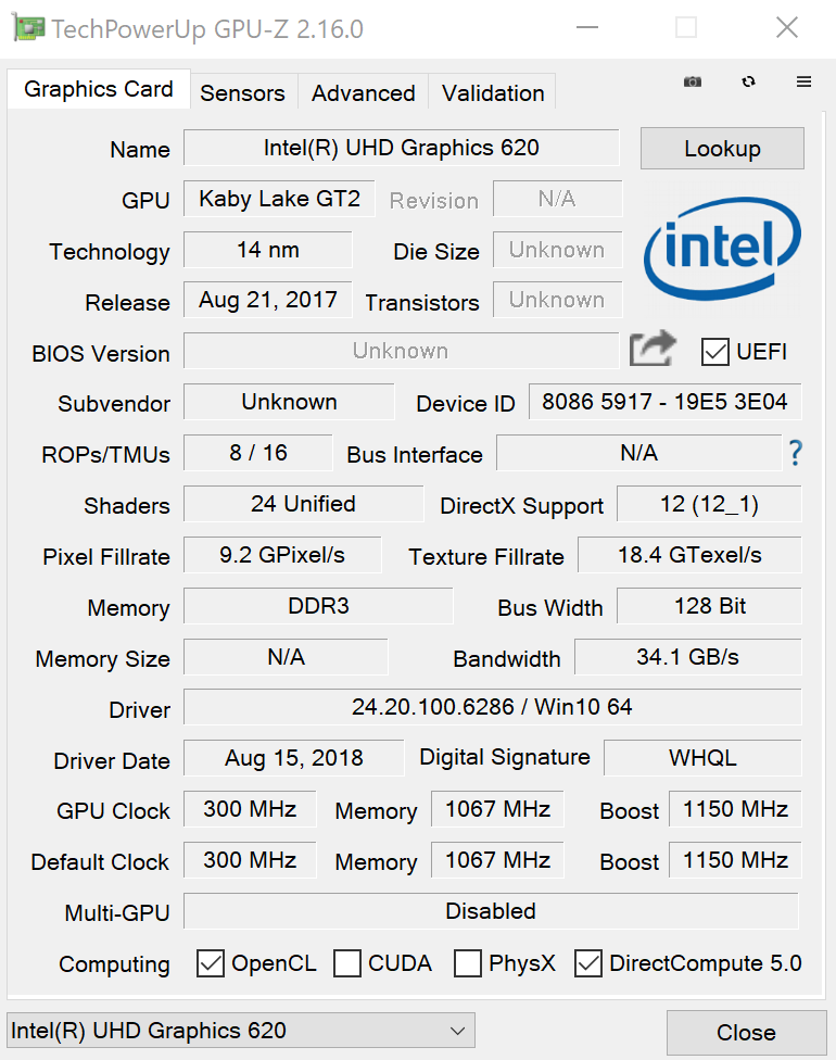 As for graphics, this laptop has both the integrated Intel UHD Graphics 620 and the dedicated NVIDIA GeForce MX150. The integrated graphics has base clock of 300MHz and a boost clock of 1150MHz, while the MX150 Graphics features 2GB GDDR5 memory, with a base clock of 937MHz with a rated boost clock of 1038MHz.