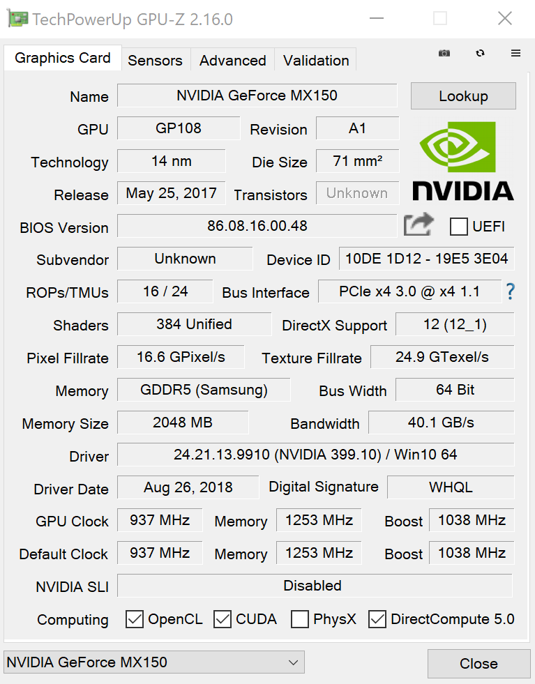 - Graphics: NVIDIA® GeForce® MX150 with 2 GB GDDR5 / Intel® UHD Graphics 620