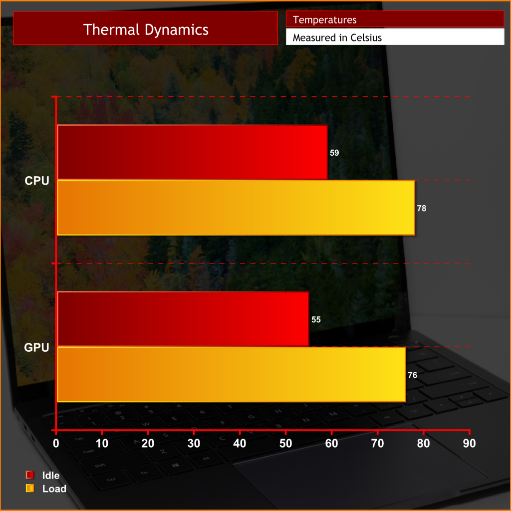 Due to the laptop being only 14.6mm thick, it's no surprise that the idle temperatures for both CPU and GPU are that bit higher than what we might expect from other, thicker machines. The MateBook is still able to keep the CPU at a reasonable temperature of 78C, however, while under full load the NVIDIA MX150 GPU peaked at 76C.