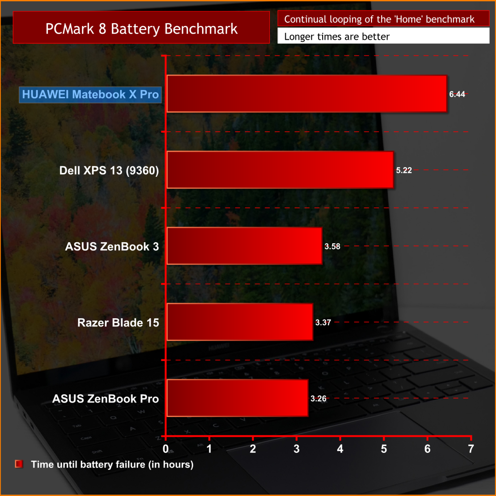 This laptop's battery life is definitely impressive. With the 57.4 Wh battery cell, we saw it last 6 hours 44 minutes in the PCMark8 battery benchmark. Bear in mind this is nearly 7 hours of continuous use – the benchmark goes through various office tasks, light gaming, text editing – so we'd easily expect anyone to get a full day's use with this machine.