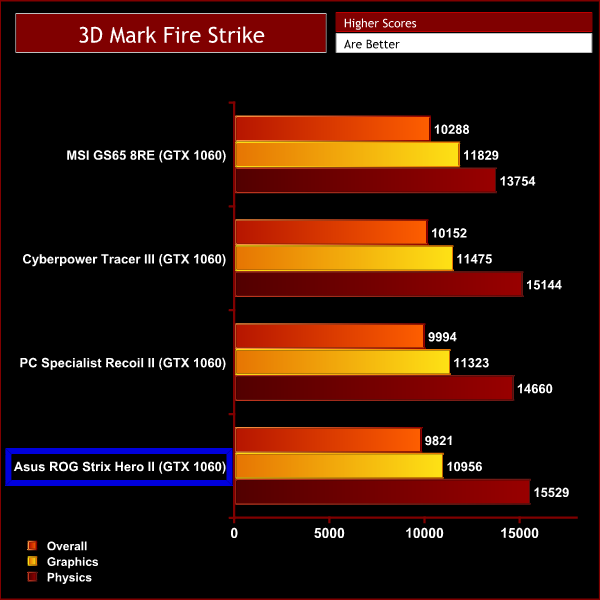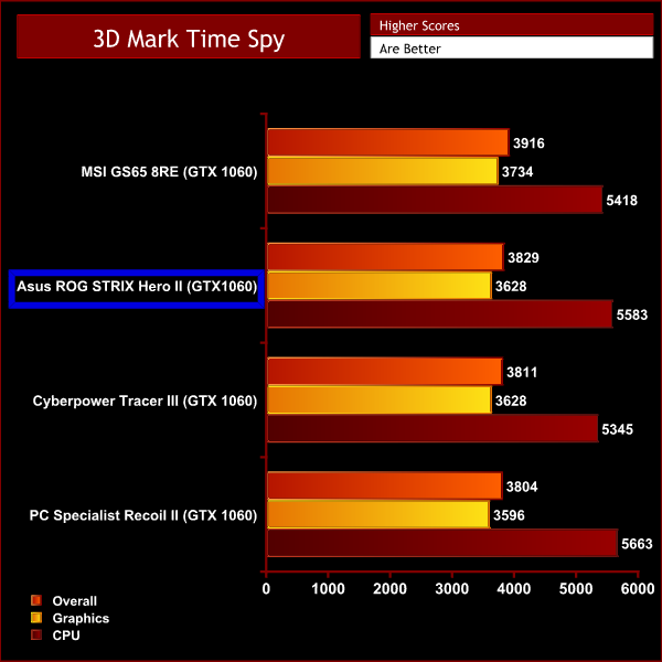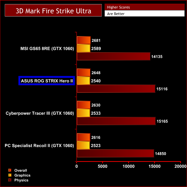 For this test, we ran the ROG Strix Hero II through Fire Strike, Fire Strike Ultra and Time Spy. In the graphs below you can see it compared against similar laptops. Even though they all have very similar specifications, slight variations in boost clock speeds caused by fluctuations in temperature have an impact on performance.